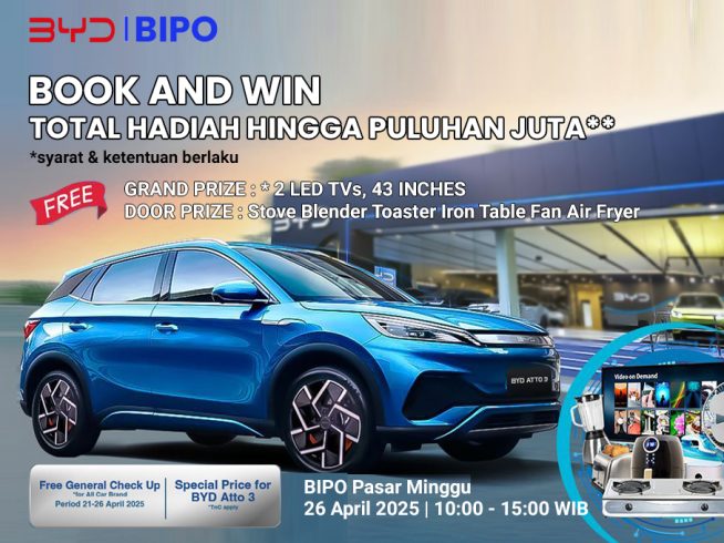 Ikuti program booking kendaraan di BYD Bipo Pasar Minggu dan dapatkan kesempatan memenangkan berbaga...